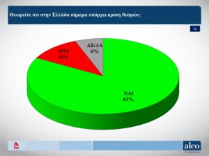 Στην ερώτηση «Υπάρχει κρίση θεσμών στην Ελλάδα;», το 83% απαντά «ναι», μόλις 11% λέει «όχι», ενώ 6% δηλώνει «δεν ξέρω/δεν απαντώ».
