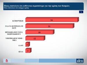 Σχετικά με το ποιος ευθύνεται περισσότερο, το 34% «δείχνει» την κυβέρνηση, το 31% θεωρεί ότι «όλα τα κόμματα ευθύνονται εξίσου», το 18% αποδίδει ευθύνη στα πρόσωπα που εκπροσωπούν τους θεσμούς, το 12% κατηγορεί τα ΜΜΕ και τα social media για υπερβολή, ενώ 2% απαντά «άλλο» και 3% «δεν γνωρίζω/δεν απαντώ».