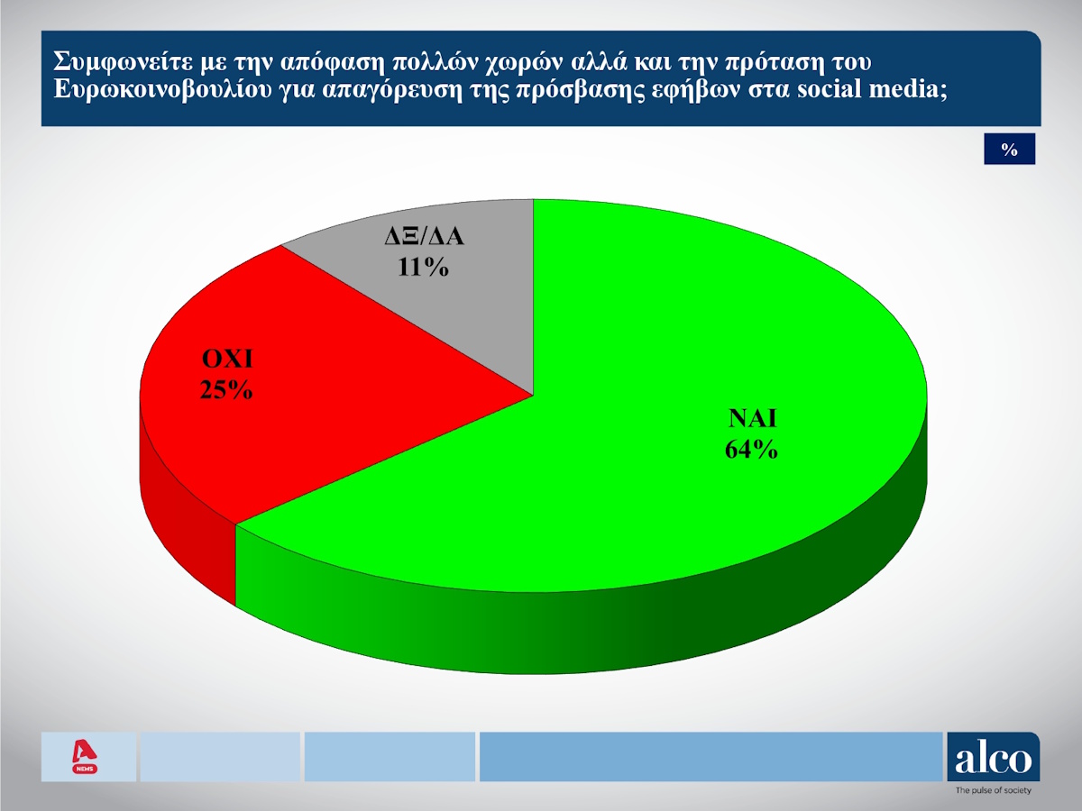 - Ακόμα, το 64% συμφωνεί με την πρόταση για την απαγόρευση πρόσβασης των ανηλίκων στα social media. Το 69% των ερωτηθέντων θεωρεί πως η κυβέρνηση δεν έχει κάνει όσα πρέπει για την καταπολέμηση της εγκληματικότητας.