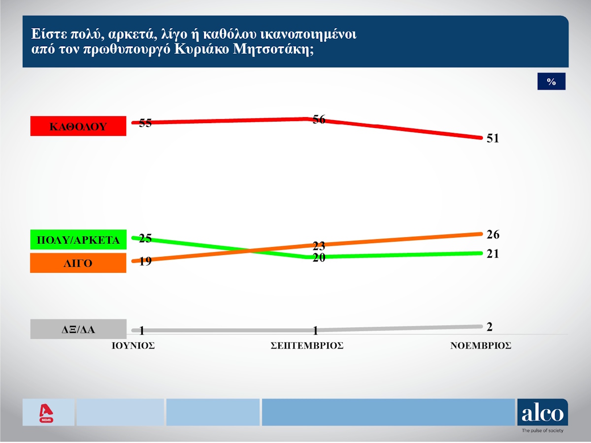 - Το 51% των συμμετεχόντων απάντησε ότι δεν είναι καθόλου ικανοποιημένο από τον πρωθυπουργό, Κυριάκο Μητσοτάκη, έναντι 26% που είναι «λίγο ικανοποιημένοι» και 21% «πολύ ικανοποιημένοι».