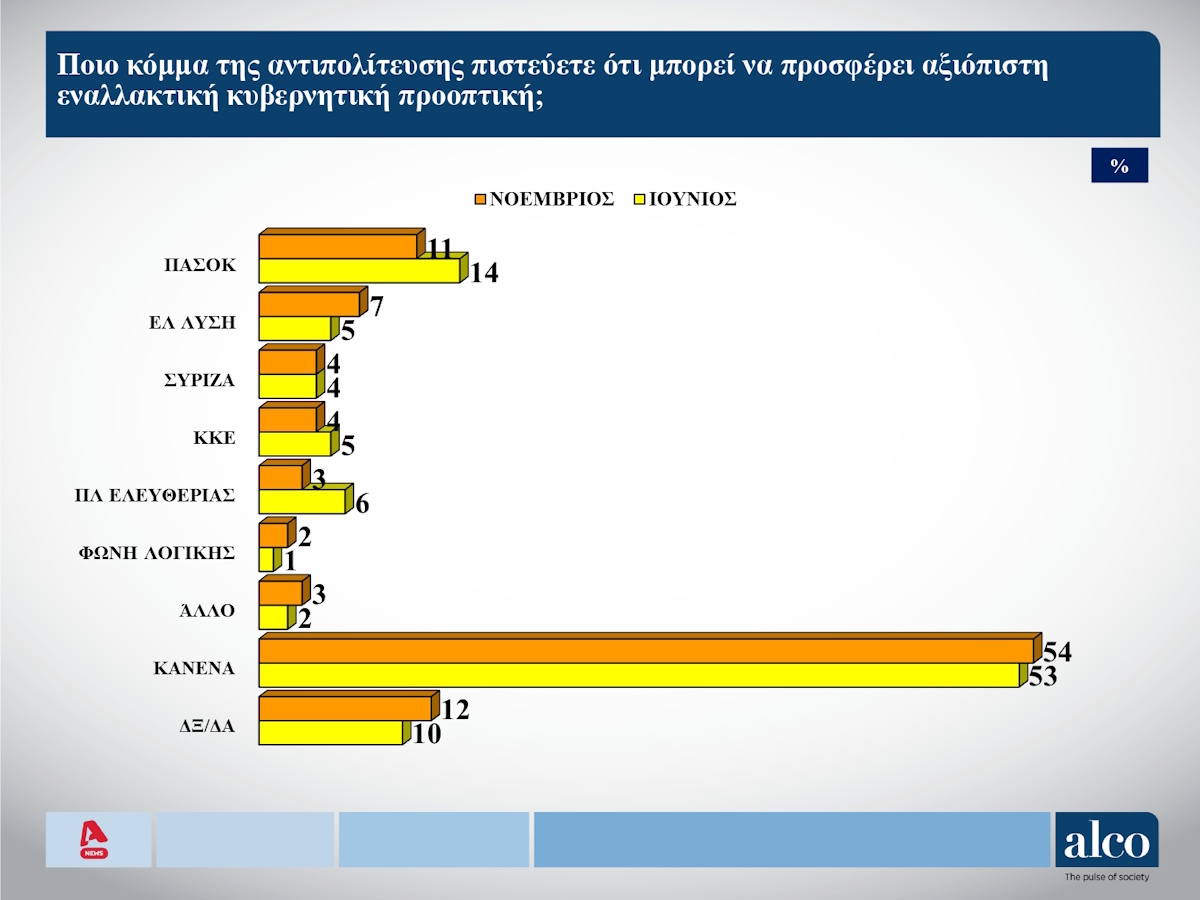 - Την ίδια ώρα, το 54% των ερωτηθέντων στη δημοσκόπηση θεωρεί ότι «κανένα κόμμα» της Αντιπολίτευσης δεν μπορεί να προσφέρει αξιόπιστη εναλλακτική κυβερνητική προοπτική.