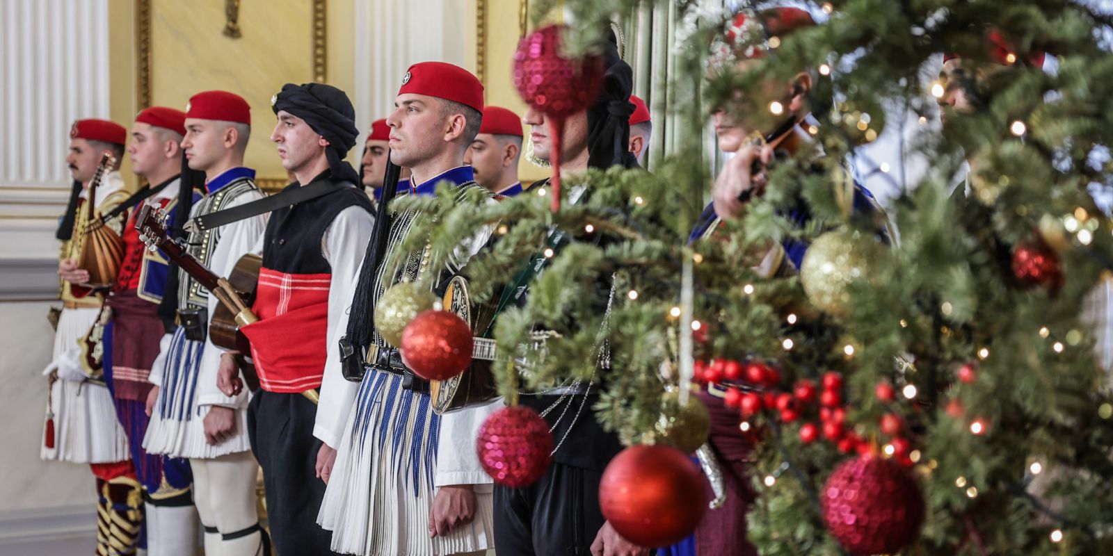 Όπως κάθε χρόνο, η τελετή ξεκίνησε με τη Μπάντα των Ενόπλων Δυνάμεων και ακολούθησε η Προεδρική Φρουρά, που έψαλε παραδοσιακά κάλαντα Χριστουγέννων και αντάλλαξε ευχές για υγεία και ευημερία με τον κ. Τασούλα.