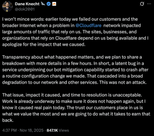 Ο Τεχνικός διευθυντής της εταιρείας, Ντέιν Κνεχτ, αναγνώρισε ότι η Cloudflare «απογοήτευσε» τους πελάτες της και εξήγησε ότι η βλάβη προήλθε από ένα κρυφό σφάλμα λογισμικού σε υπηρεσία που σχετίζεται με συστήματα διαχείρισης bot.