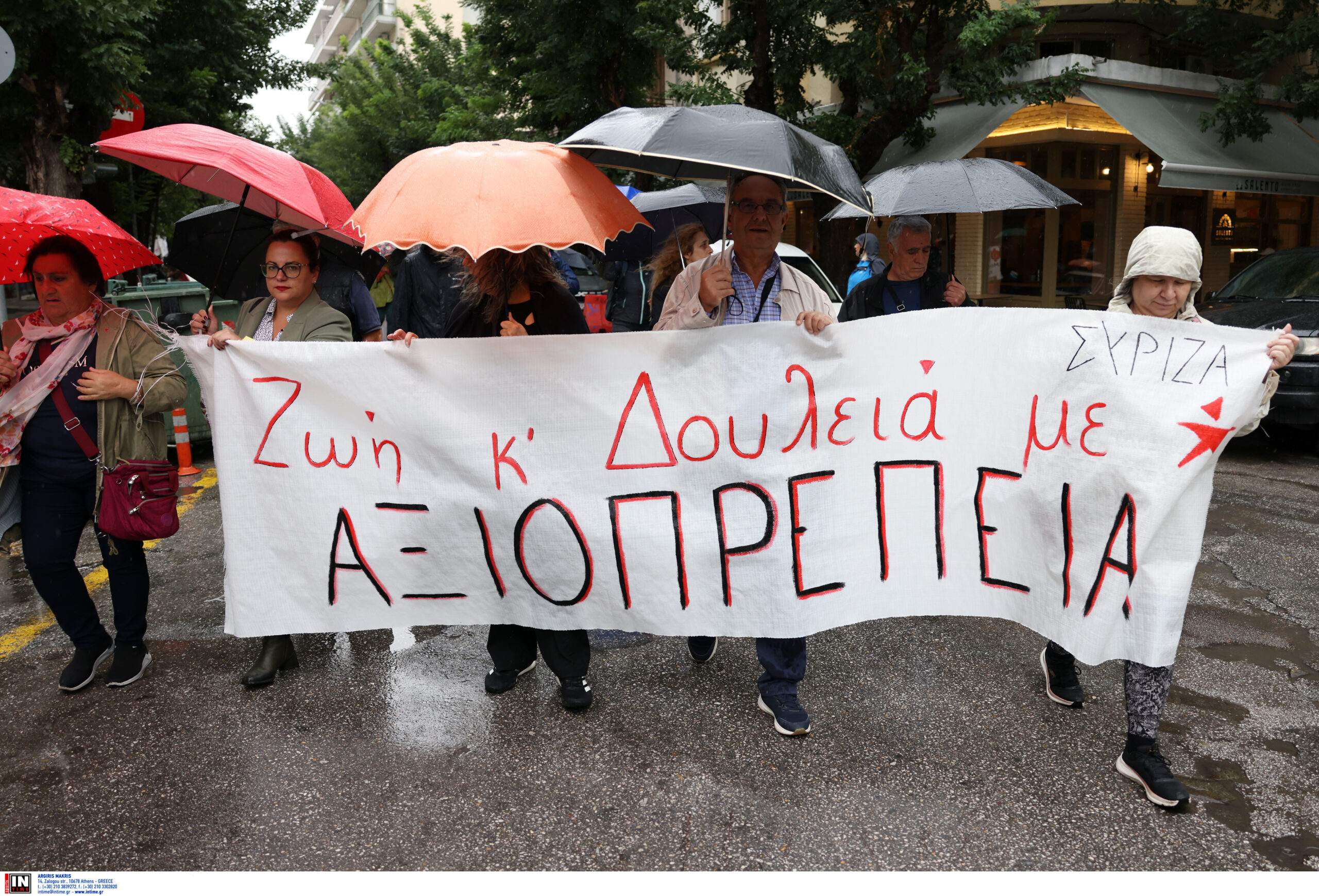 «Όχι στη 13ωρη δουλειά-σκλαβιά», «Μπλόκο στο αντεργατικό τερατούργημα και τις πειθαρχικές διώξεις», «Δεν θα τους αφήσουμε να πάνε τη ζωή μας… τρένο» ήταν μερικά από τα συνθήματα που αναγράφονταν στα πανό που κρατούσαν διαδηλωτές σε τρεις συγκεντρώσεις, οι οποίες έγιναν υπό βροχή, στο κέντρο της πόλης.
