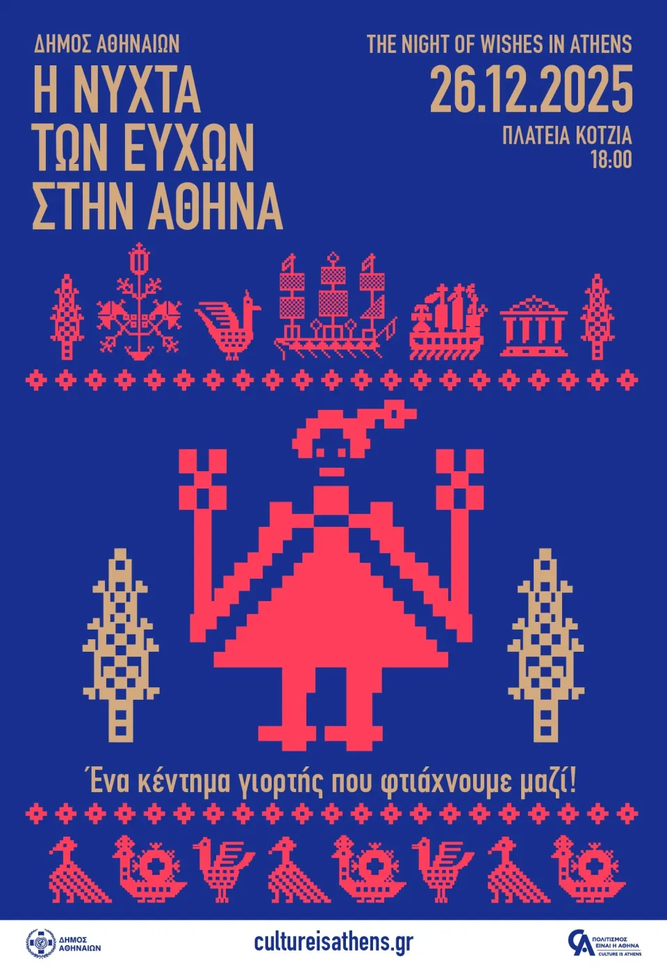 Μεταφέρεται για την Παρασκευή 26/12 η «Νύχτα των Ευχών» στην Πλατεία Κοτζιά καθώς σύμφωνα με το Έκτακτο Δελτίο Επιδείνωσης Καιρού της ΕΜΥ, έντονα καιρικά φαινόμενα θα εκδηλωθούν στην Αττική το βράδυ της Παραμονής των Χριστουγέννων, όπου ήταν προγραμματισμένη η εκδήλωση.