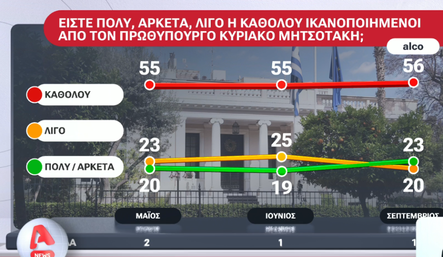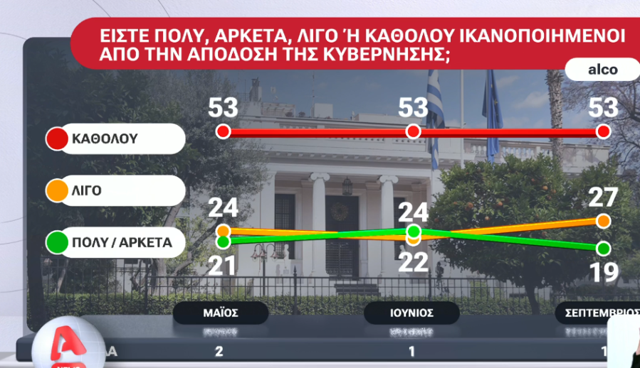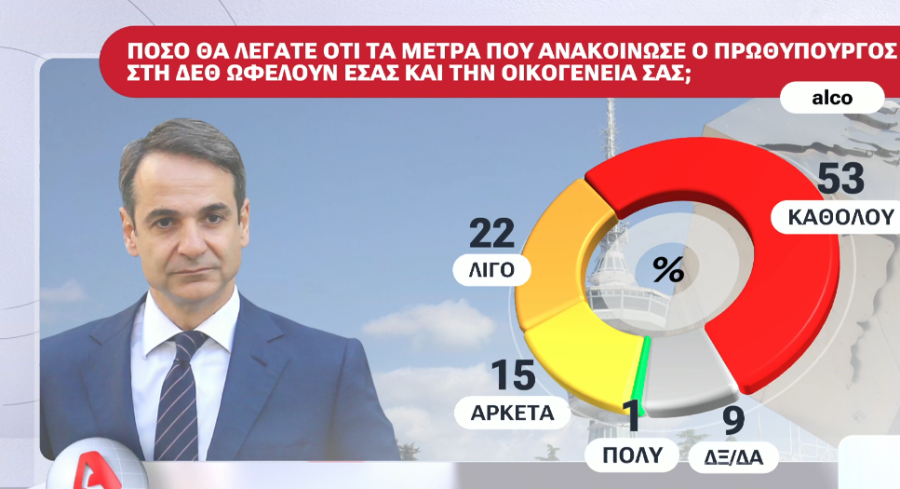Η νέα δημοσκόπηση της ALCO για τον Alpha καταγράφει με σαφήνεια το βαρύ κλίμα δυσαρέσκειας απέναντι στην κυβέρνηση και προσωπικά στον Κυριάκο Μητσοτάκη. Παρά τις εξαγγελίες στη ΔΕΘ, οι πολίτες δηλώνουν σε ποσοστό 53% ότι τα μέτρα δεν τους ωφελούν καθόλου, ενώ μόλις το 1% απαντά ότι ωφελείται «πολύ». Το Μαξίμου, αντί να ανατρέψει την αρνητική εικόνα, βλέπει τη δυσπιστία να εδραιώνεται.