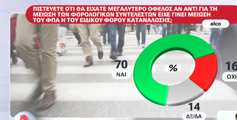 Η μεγάλη πλειοψηφία (70%) θεωρεί ότι θα είχε μεγαλύτερο όφελος αν η κυβέρνηση μείωνε τον ΦΠΑ ή τον ειδικό φόρο κατανάλωσης αντί να παίζει με τους φορολογικούς συντελεστές. Η κοινωνία ζητά ουσιαστική ελάφρυνση στην καθημερινότητα, αλλά το οικονομικό επιτελείο προτιμά να διατηρεί την ακρίβεια στα ράφια και τα καύσιμα.