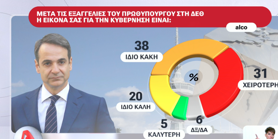 Στην ερώτηση αν οι εξαγγελίες της ΔΕΘ βελτίωσαν την εικόνα της κυβέρνησης, το 38% δηλώνει ότι παραμένει ίδια κακή, το 31% ότι χειροτέρεψε και μόλις το 5% ότι έγινε καλύτερη. Ουσιαστικά, 7 στους 10 πολίτες βλέπουν τη ΔΕΘ ως ένα επικοινωνιακό πυροτέχνημα χωρίς ουσία.