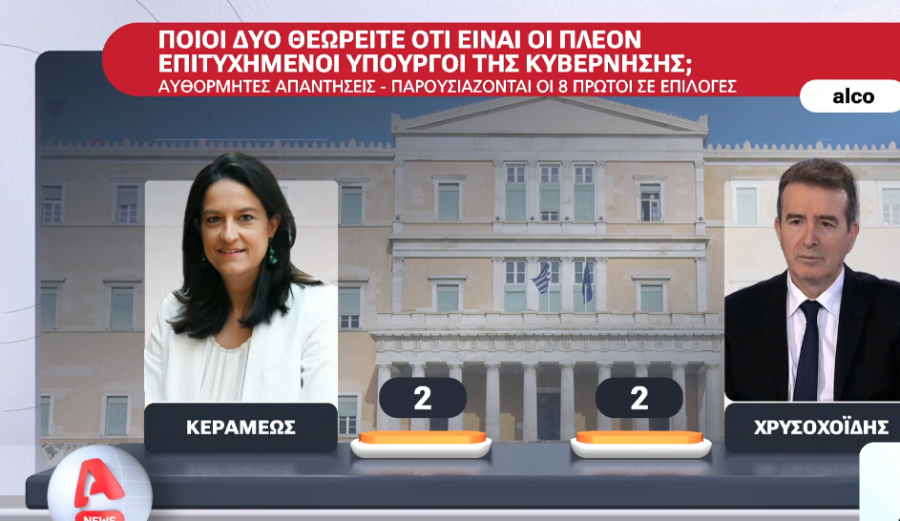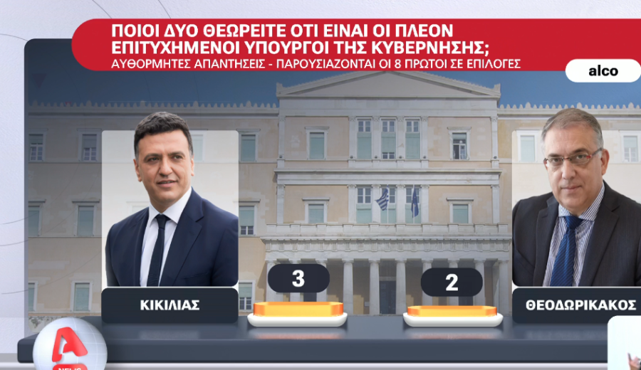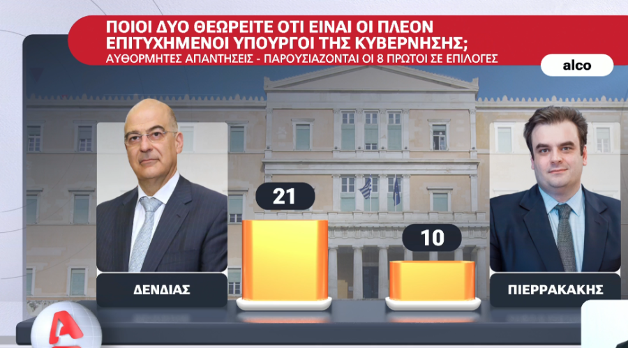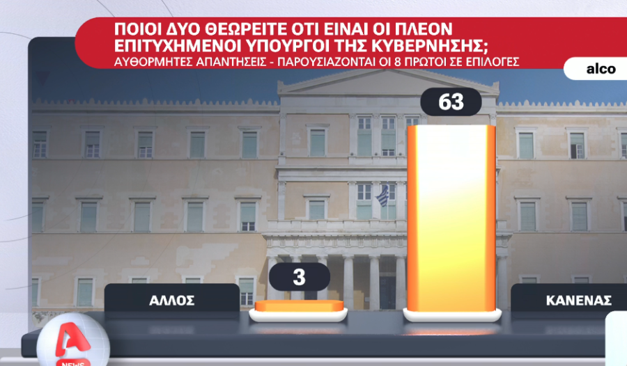 Εντυπωσιακό εύρημα είναι ότι το 63% απαντά «κανένας» στην ερώτηση για τους πιο επιτυχημένους υπουργούς – ποσοστό αυξημένο κατά 11 μονάδες σε σχέση με τον Ιούνιο. Ο Νίκος Δένδιας καταγράφει 21%, ο Κυριάκος Πιερρακάκης 10%, ενώ Χατζηδάκης και Γεωργιάδης μένουν στο 7%. Στην ουσία, οι πολίτες θεωρούν ότι η κυβέρνηση δεν έχει καμία αξιόπιστη φωνή.