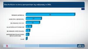 Η ακρίβεια αναδεικνύεται ως το κυρίαρχο πρόβλημα της κοινωνίας. Το 54% ζητά ως πρώτη προτεραιότητα τη μείωση της ακρίβειας, με μεγάλη απόσταση να ακολουθούν η διαφάνεια και αξιοκρατία (17%) και οι βελτιώσεις στο ΕΣΥ (15%).