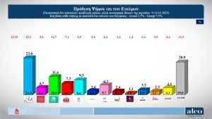 Στην πρόθεση ψήφου επί των εγκύρων, η Νέα Δημοκρατία παραμένει πρώτη με 23,6%, ακολουθεί το ΠΑΣΟΚ με 11,6%, ενώ ο ΣΥΡΙΖΑ καταγράφεται στο 4,7%. Σημαντικό παραμένει το ποσοστό των αναποφάσιστων, που φτάνει το 20,9%, υπογραμμίζοντας τη ρευστότητα του πολιτικού σκηνικού.