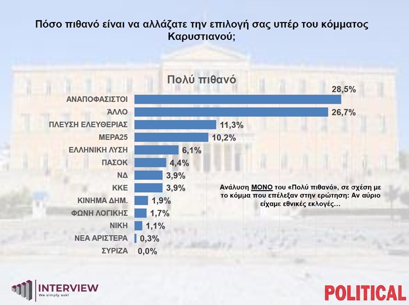 Αυτοί που δήλωσαν πως είναι «πολύ πιθανό» να αλλάξουν την επιλογή τους αντικαθιστώντας τη με το κόμμα της Μαρίας Καρυστιανού είναι: αναποφάσιστοι 28,5%, Άλλο 26,7%, Πλεύση Ελευθερίας 11,3%, ΜέΡΑ25 10,2%, Ελληνική Λύση 6,1%, ΠΑΣΟΚ 4,4%, Νέα Δημοκρατία 3,9%, ΚΚΕ 3,9%, Κίνημα Δημοκρατίας 1,9%, Φωνή Λογικής 1,7%, Νίκη 1,1%, Νέα Αριστερά 0,3% και ΣΥΡΙΖΑ 0%.