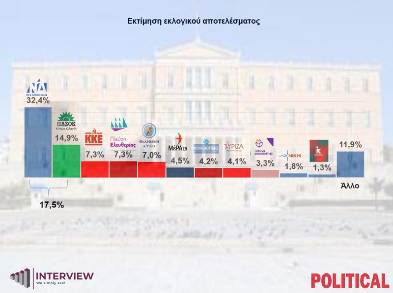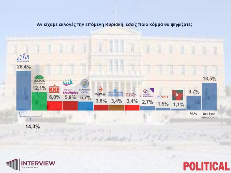 Στην πρόθεση ψήφου της συγκεκριμένης δημοσκόπησης η Νέα Δημοκρατία καταγράφει 26,4%, το ΠΑΣΟΚ 12,1% , ΚΚΕ 6%, Πλεύση Ελευθερίας 5,9%, Ελληνική Λύση 5,7%, ΜέΡΑ25 3,6%, Φωνή Λογικής 3,4%, Κίνημα Δημοκρατίας 2,7%, Νίκη 1,5%, Νέα Αριστερά 1,1%, Άλλο 9,7% και «δεν έχω αποφασίσει» 18,5%.