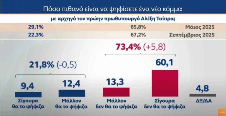 Όταν τίθεται το ερώτημα της ίδρυσης νέου κόμματος το 21,8% είναι θετικά προσκείμενο στο ενδεχόμενο να τον ψηφίσει ενώ το 73,4% δηλώνει πως δεν θα ψήφιζε ένα κόμμα με επικεφαλής τον Αλέξη Τσίπρα.