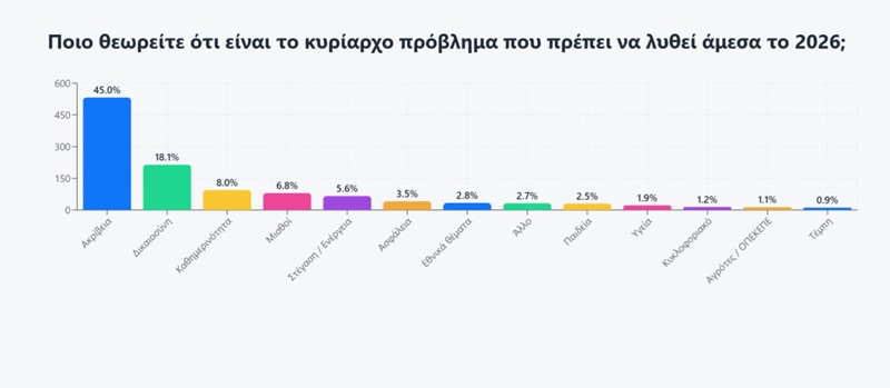 Στο ερώτημα «ποιο είναι το κυρίαρχο πρόβλημα το οποίο πρέπει να λυθεί άμεσα το 2026», χωρίς αντίπαλο ήταν η ακρίβεια (45%), με -μακράν- δεύτερο την δικαιοσύνη (18,1%).