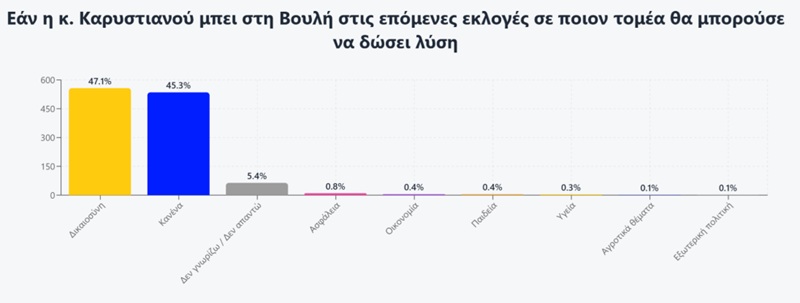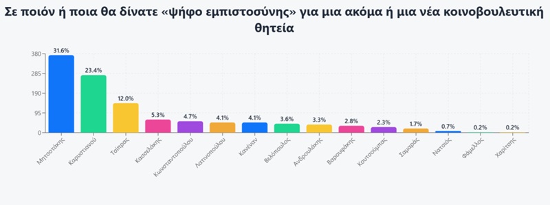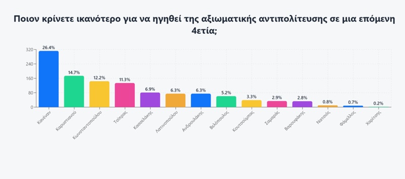 Ο Έλληνας ψηφοφόρος, θέλει νέα πρόσωπα όπως την κυρία Καρυστιανού (το 53,9% θεωρεί ότι θα μπει στην Βουλή), επιλέγει για τον ρόλο της αξιωματικής αντιπολίτευσης τους έντονα αντισυστημικούς (Καρυστιανού 14,7% και Κωνσταντοπούλου 12,2%).