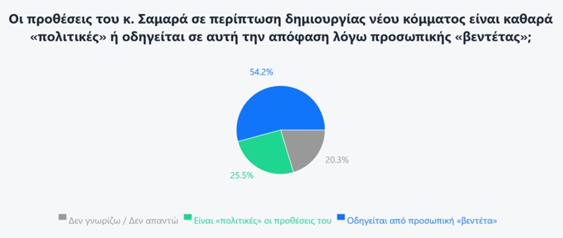 Σε ό,τι αφορά τον λόγο για τον οποίο θα έκανε δικό του κόμμα ο Αντώνης Σαμαράς, οι ερωτηθέντες φαίνονται ελαφρώς διχασμένοι, με την πλειοψηφία να θεωρεί για λόγους προσωπικής βεντέτας, 20,3% να μην είναι απόλυτα σίγουρο για την απάντησή του, ενώ το 25,5% να λέει ότι οι προθέσεις του είναι καθαρά πολιτικές.