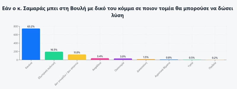 Όσον αφορά τον έτερο πρώην πρωθυπουργό, Αντώνη Σαμαρά, παραμένει κι εκείνος σημείο αναφοράς, κυρίως όσον αφορά στην εξωτερική πολιτική, όπου οι ερωτηθέντες σε ποσοστό 16,5% απαντούν ότι θα μπορούσε να προσφέρει λύσεις.