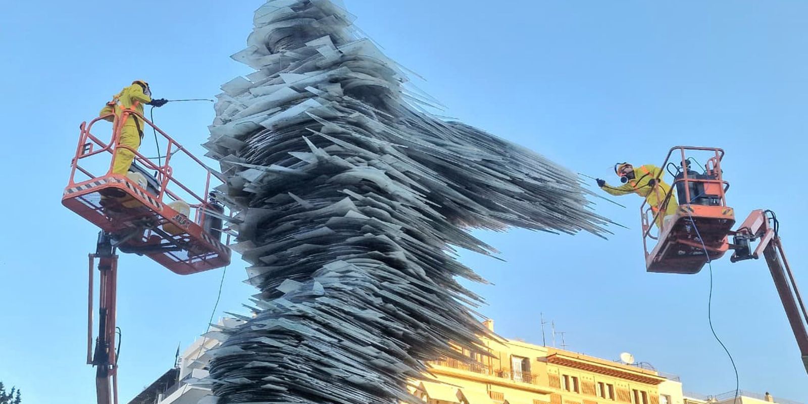 Ο καθαρισμός έγινε με εξοπλισμό της Kärcher, ενώ ο Δήμος Αθηναίων παρείχε νερό, ρεύμα, περίφραξη και πρόσβαση, εξασφαλίζοντας την προστασία του κοινού και του πρασίνου. Οι χιλιάδες γυάλινες πλάκες του γλυπτού απαιτούν ιδιαίτερη προσοχή, καθιστώντας τη διαδικασία απαιτητική αλλά και ουσιαστική για τη διατήρηση της αισθητικής και ιστορικής αξίας του μνημείου.