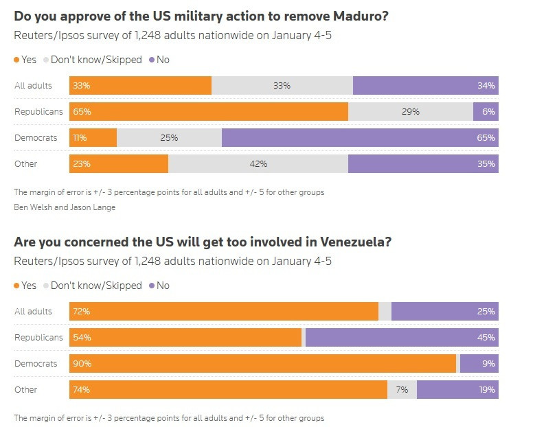 Μόλις ένας στους τρεις Αμερικανούς επιδοκιμάζει την στρατιωτική επίθεση που εξαπέλυσαν οι ΗΠΑ εναντίον της Βενεζουέλας για την ανατροπή του προέδρου Νικολάς Μαδούρο, την ώρα μάλιστα που το 72% ανησυχεί για το ενδεχόμενο μεγαλύτερης εμπλοκής στη χώρα, σύμφωνα με δημοσκόπηση του Ινστιτούτου Ipsos για λογαριασμό του πρακτορείου ειδήσεων Reuters.
