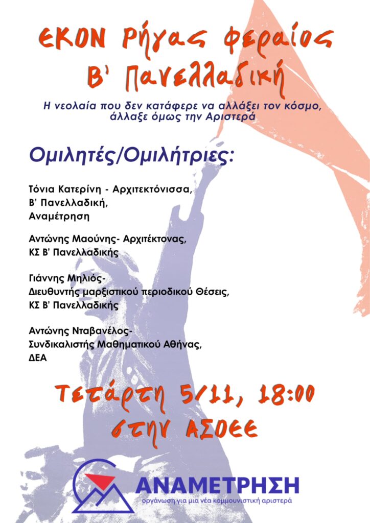 Η Αναμέτρηση διοργανώνει εκδήλωση-αφιέρωμα στην ιστορία και τη συμβολή της Β’ Πανελλαδικής στην εξέλιξη της αριστερής σκέψης και πολιτικής δράσης, με τίτλο «ΕΚΟΝ Ρήγας Φεραίος – Β’ Πανελλαδική: Η νεολαία που δεν κατάφερε να αλλάξει τον κόσμο, άλλαξε όμως την Αριστερά».