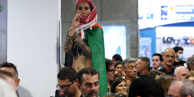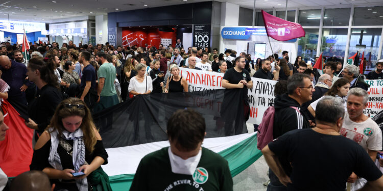 Εκατοντάδες πολίτες βρέθηκαν στο αεροδρόμιο κρατώντας παλαιστινιακές σημαίες και πανό, φωνάζοντας συνθήματα υπέρ της Παλαιστίνης και ενάντια στην ισραηλινή επίθεση.