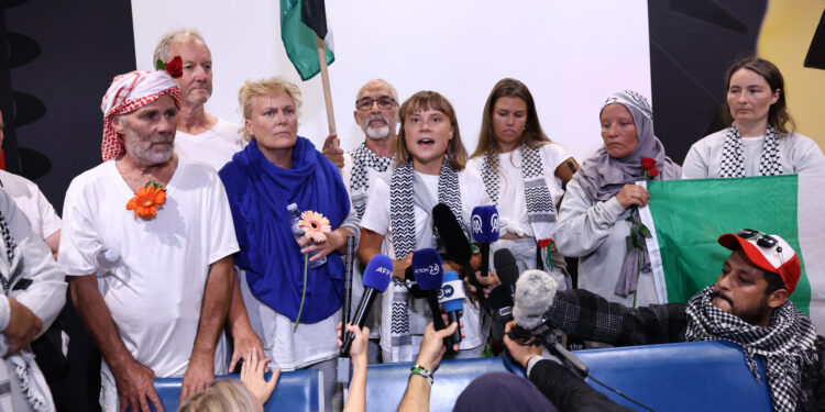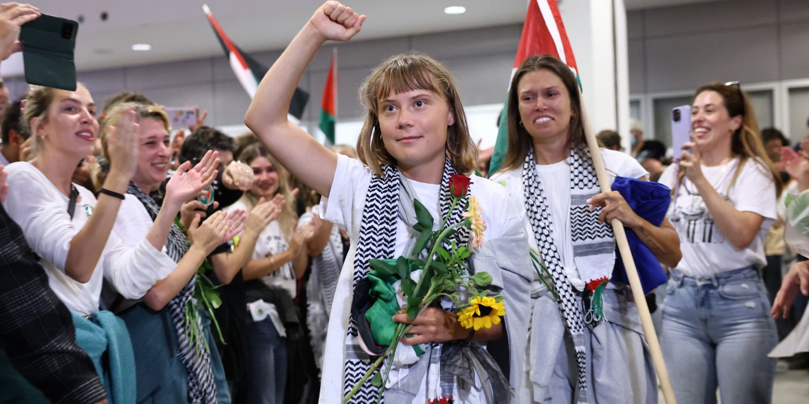 Την παρουσία της στην υποδοχή έδωσε και η Γκρέτα Τούνμπεργκ, η γνωστή ακτιβίστρια για το κλίμα, που εξέφρασε τη στήριξή της στους συμμετέχοντες του Global Sumud Flotilla.