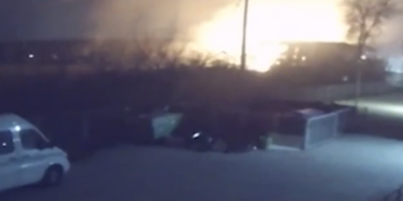Το υλικό από κάμερα ασφαλείας καταγράφει από μακριά τη στιγμή της έκρηξης, όταν μια εκτυφλωτική λάμψη διαπερνά το σκοτάδι και ακολουθεί το ωστικό κύμα που πλήττει τις εγκαταστάσεις. Μέσα σε ελάχιστα δευτερόλεπτα, η νύχτα γίνεται μέρα και το μέγεθος της καταστροφής αποτυπώνεται καθαρά στα πλάνα.