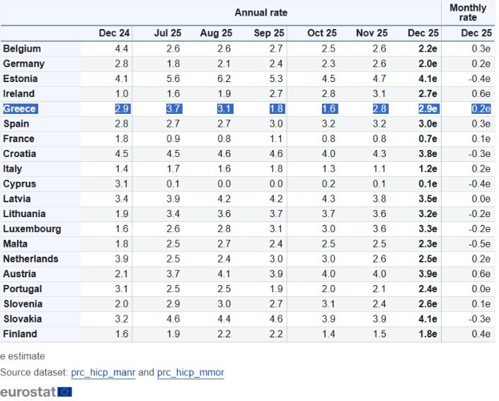 Ενισχυτικές τάσεις παρουσίασε ο πληθωρισμός στην Ελλάδα τον Δεκέμβριο του 2025, σύμφωνα με τα στοιχεία της Eurostat, με τον ετήσιο δείκτη τιμών καταναλωτή να διαμορφώνεται στο 2,9%. Πρόκειται για νέα άνοδο σε σχέση με τον Νοέμβριο, όταν ο πληθωρισμός είχε ανέλθει στο 2,8%, μετά από δύο συνεχόμενους μήνες αποκλιμάκωσης.