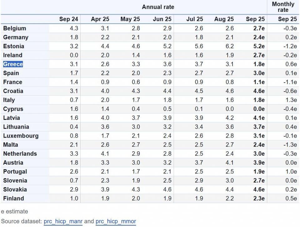 Στις κατά τόπους μετρήσεις της Eurostat, ο υψηλότερος ετήσιος ρυθμός πληθωρισμού τον Σεπτέμβριο παρατηρήθηκε στην Εσθονία με 5,2%, ενώ ακολούθησαν η Κροατία και η Σλοβακία με 4,6% αμφότερες.