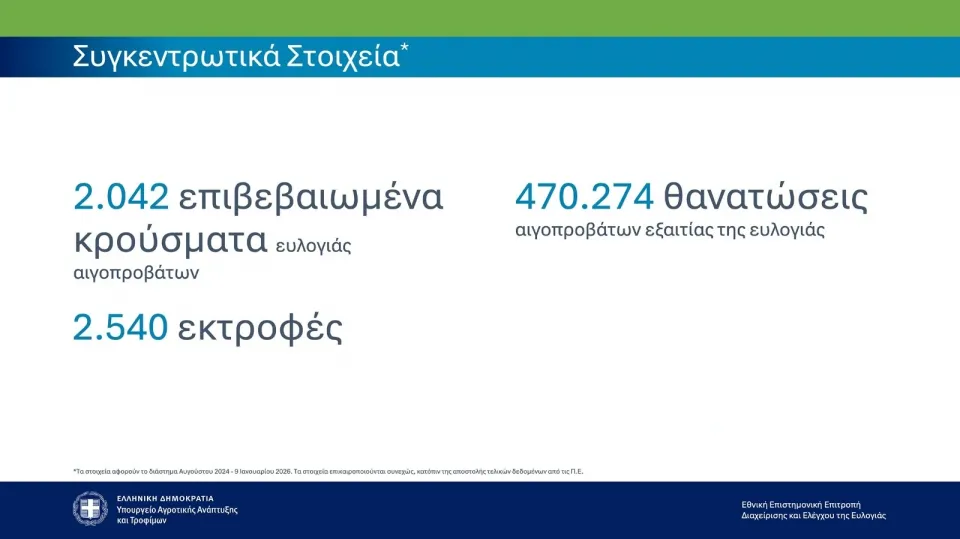 Σε 470.274 ανέρχονται τα ζώα που έχουν θανατωθεί από τον Αύγουστο 2024 και έως τις 9 Ιανουαρίου στο πλαίσιο εφαρμογής των προβλεπόμενων υγειονομικών πρωτοκόλλων για την αντιμετώπιση της ευλογιάς των αιγοπροβάτων, σύμφωνα με στοιχεία της Εθνικής Επιστημονικής Επιτροπής Διαχείρισης και Ελέγχου της ευλογιάς των αιγοπροβάτων (ΕΕΕΔΕΕ) και του υπουργείου Αγροτικής Ανάπτυξης και Τροφίμων.