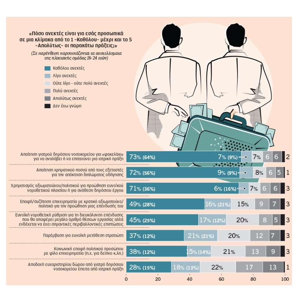 Το 85% των πολιτών πιστεύει ότι η ελληνική κοινωνία δείχνει ανοχή στη διαφθορά, κυρίως λόγω της έμφασης στο ατομικό συμφέρον (39%) και της πεποίθησης ότι «τίποτα δεν αλλάζει» (32%). Λιγότερο ανεκτές πράξεις είναι το «φακελάκι» σε νοσοκομεία, η δωροδοκία για δίπλωμα οδήγησης και ο χρηματισμός πολιτικών για ανάθεση έργου. Πιο ανεκτές εμφανίζονται οι επαφές επιχειρηματιών με κρατικούς παράγοντες για επενδύσεις και οι ευνοϊκές ρυθμίσεις που υπόσχονται νέες θέσεις εργασίας, ακόμη κι αν συνεπάγονται κινδύνους.