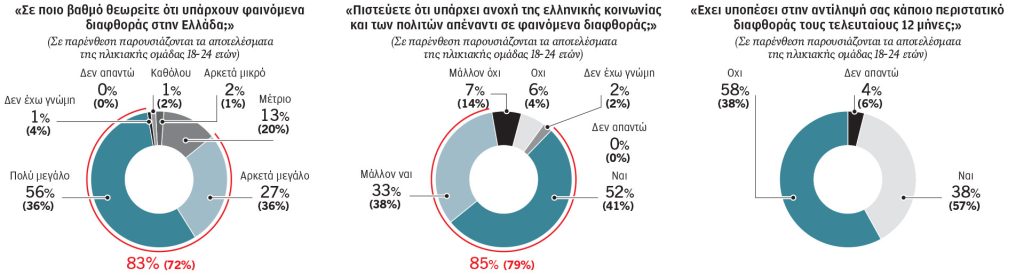 Η συνηθέστερη εμπειρία διαφθοράς αφορά το «φακελάκι» για επίσπευση διαδικασίας (27%), ενώ ακολουθεί το «μέσο» (10%). Την ίδια ώρα, οι πολίτες θεωρούν ότι η διαφθορά είναι έντονη στην πολιτική (85%), στα δημόσια έργα (77%), στα ΜΜΕ (73%), στα δημόσια οικονομικά (70%), στη Δικαιοσύνη (63%), στα ΕΣΠΑ (63%), στην υγεία (56%), αλλά και στην Αστυνομία (51%). Μοναδική εξαίρεση αποτελούν οι Ένοπλες Δυνάμεις, όπου η πλειοψηφία (40%) εκτιμά ότι η διαφθορά είναι μικρή ή ανύπαρκτη – παρότι το 39% των νέων έως 24 ετών θεωρεί το αντίθετο.