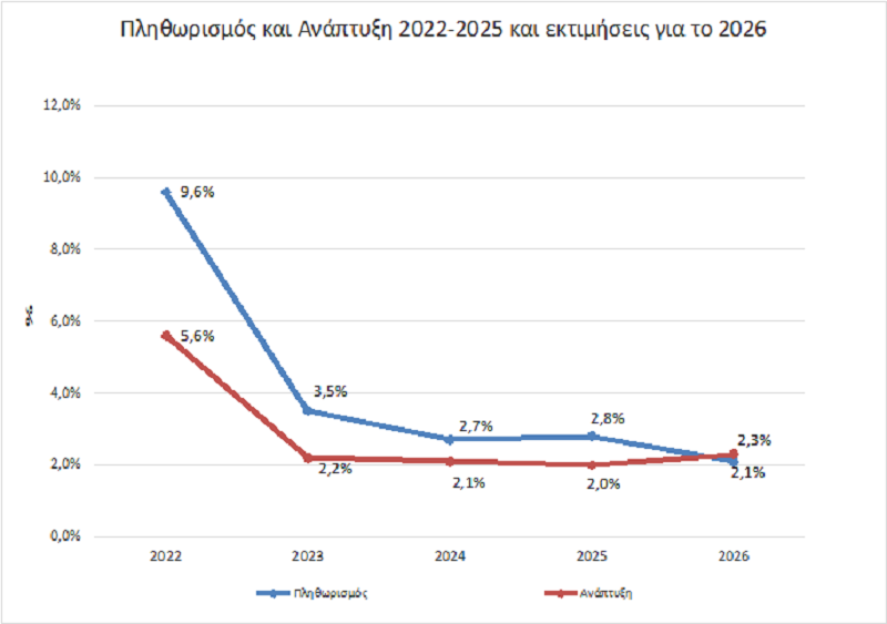 Η ελληνική οικονομία κατά το 2025 ανέδειξε ως κύρια χαρακτηριστικά τα ίδια με αυτά των τελευταίων ετών. Δημοσιονομική πειθαρχία προσαρμοσμένη στους νέους δημοσιονομικούς κανόνες νεοφιλελεύθερης έμπνευσης, περιεχομένου και στρατηγικής της Ευρωπαϊκής Επιτροπής με την περιθωριοποίηση, μεταξύ άλλων, της αναπτυξιακής και κοινωνικής προοπτικής. Ως στόχο είχε κατά το 2025 την αύξηση του ΑΕΠ κατά 2,3% με τελικό ρυθμό αύξησης του ΑΕΠ το 2%. Η επίσημη πρόβλεψη (Κρατικός Προϋπολογισμός του 2026) θεωρεί ότι ο ρυθμός αύξησης του ΑΕΠ το 2026 θα είναι 2,4% και μετά την λήξη (τέλος 2026) των πόρων του Ταμείου Ανάκαμψης και Ανθεκτικότητας ο ρυθμός αύξησης του ΑΕΠ ακολουθεί πτωτική τάση (1,7% το 2027, 1,6% το 2028, 1,3% το 2029), σε βαθμό που ο μέσος ρυθμός μεταβολής του ΑΕΠ (1,25%) κατά τα επόμενα χρόνια να επαναλαμβάνει το επίπεδο αύξησης της περιόδου πριν την κρίση χρέους. Βέβαια η βασική αιτία αυτής της πτωτικής τάσης μεταβολής του ΑΕΠ κατά τα επόμενα χρόνια θα είναι, σύμφωνα με τις εκτιμήσεις του Πολυετή Δημοσιονομικού Προγραμματισμού 2026-2029, η μείωση του ρυθμού μεταβολής των επενδύσεων. Έτσι από τον ρυθμό αύξησης των επενδύσεων της τάξης του 5,7% το 2025, το 2026 εκτιμάται ότι θα είναι 10,2%, το 2027 4,1%, το 2028 0,9% και το 2029 0,9%, με ό,τι αυτό αρνητικά συνεπάγεται για το επενδυτικό (16% του ΑΕΠ, κατά κύριο λόγο, για εξαγορές επιχειρήσεων, για κατασκευές και κατοικίες ) και το παραγωγικό έλλειμμα της χώρας μας σε σχέση με τον μέσο όρο(21% του ΑΕΠ) της Ε.Ε.-27(Κ. Καλλίτση, KReport,14/12/2025). Παράλληλα η αύξηση του πληθωρισμού κατά 2,8% το 2025 συνέβαλε στην υπερ-απόδοση των έμμεσων φόρων κατανάλωσης (42,5 δις ευρώ) αλλά η μεγαλύτερη αυτή αύξηση από αυτή του ΑΕΠ συνέβαλε στην συνέχιση της μείωσης της αγοραστικής δύναμης, κυρίως, των συνταξιούχων αφού η αύξηση των συντάξεων από 1/1/2026 θα είναι μικρότερη (2,4%), καλύπτοντας έτσι μόνο το 70% της αντίστοιχης σωρευτικής μεταβολής του ΑΕΠ και διευρύνοντας περαιτέρω τις εισοδηματικές και τις κοινωνικές ανισότητες (Διάγραμμα 1).