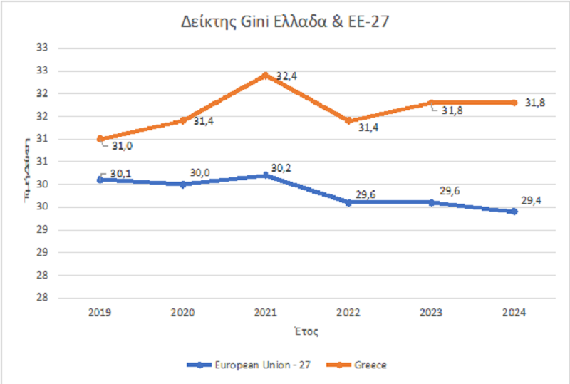 Παράλληλα η κατανάλωση του ιδιωτικού και του δημόσιου τομέα αποτελεί το 70% του ΑΕΠ και οι έμμεσοι φόροι στην Ελλάδα αποτελούν το 68% των εσόδων του κράτους από φόρους. Από την άποψη αυτή είναι ενδιαφέρον να σημειωθεί ότι στην Ελλάδα οι έμμεσοι φόροι το 1960 αποτελούσαν το 80% των φορολογικών εσόδων και από το 1990 μέχρι το 2023 αποτελούσαν το 68%, ενώ στην Ε.Ε.-27 αποτελούν το 45%. Αυτό σημαίνει ότι ιστορικά στην Ελλάδα καθόλη τη μεταπολεμική περίοδο, δηλαδή επί 75 έτη, δεσπόζει, μεταξύ άλλων, η υψηλή έμμεση φορολογία και η εισοδηματική ανισότητα στο εσωτερικό της διάρθρωσης και της κατανομής της φορολογικής επιβάρυνσης σε βάρος των μεσαίων και των χαμηλών εισοδημάτων. Το δεδομένο αυτό, μεταξύ άλλων, στην χώρα μας έχει αλλοιώσει τον χαρακτήρα και τον ρόλο του φορολογικού συστήματος (δευτερογενής κατανομή των πόρων), με την έννοια ότι συμβάλλει στην ανισοκατανομή παρά στην αναδιανομή του εισοδήματος. Η παρατήρηση αυτή αποδεικνύει την αύξηση των ανισοτήτων, όπως αποτυπώνεται και από την αυξητική πορεία του δείκτη Gini τα τελευταία έξι έτη, όταν αντίστοιχα στην Ευρώπη ο δείκτης Gini παρουσιάσει πτωτική πορεία κατά το αντίστοιχο χρονικά διάστημα (Διάγραμμα 2).