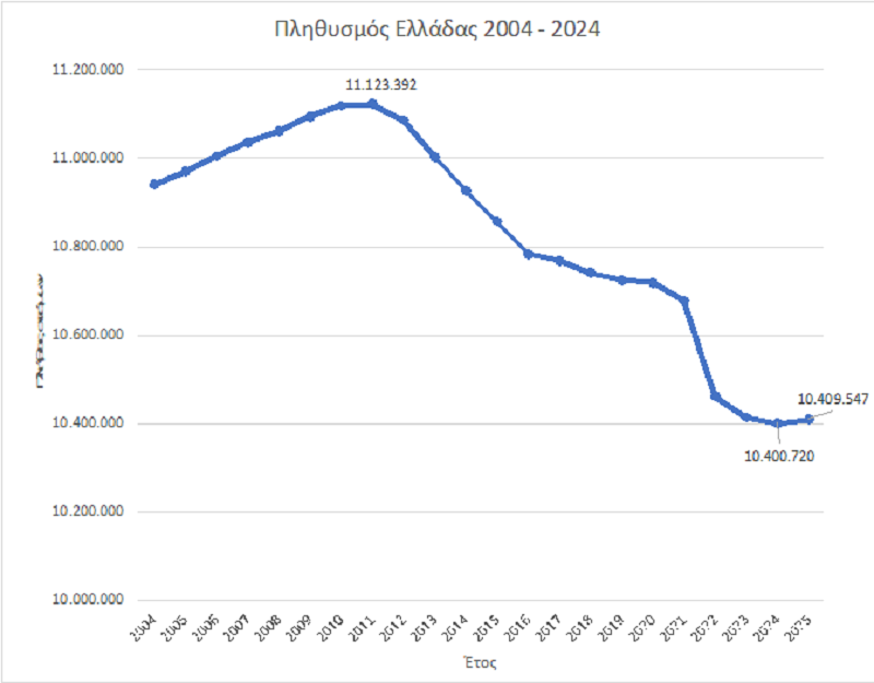 Όσον αφορά τον πληθυσμό την 1/1/2025 ο πληθυσμός της Ελλάδας εκτιμήθηκε σε 10.409.547 άτομα παρουσιάζοντας αύξηση στο χρονικό διάστημα 2004-2025 μόνο το 2012 (11.123.392 άτομα) (Διάγραμμα 3).