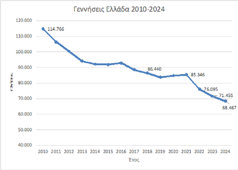 Το παράδοξο είναι ότι ο πληθυσμός παρουσίασε αύξηση ενώ το φυσικό ισοζύγιο (διαφορά γεννήσεων και θανάτων) παρουσίασε ιστορικό αρνητικό επίπεδο, όπως και οι γεννήσεις παρουσίασαν ιστορικό χαμηλό επίπεδο, δεδομένου ότι το 2024 ήταν μόλις 68.467 γεννήσεις, ενώ οι θάνατοι ήταν 126.129 άτομα. Έτσι το φυσικό πληθυσμιακό ισοζύγιο ήταν αρνητικό κατά 57.662 άτομα. Όμως, παρόλα αυτά ο πληθυσμός παρουσίασε αύξηση κατά 8.827 άτομα και αυτό λόγω των θετικών μεταναστευτικών ροών αφού οι εισερχόμενοι μετανάστες ξεπέρασαν τους εξερχόμενους κατά 66.489 άτομα, υπερκαλύπτοντας έτσι το ιστορικό αρνητικό επίπεδο του ισοζυγίου γεννήσεων-θανάτων. Για το 2025 εκτιμούμε ότι οι γεννήσεις θα συνεχίσουν την πτωτική πορεία φτάνοντας τις 67.000 γεννήσεις, ενώ οι θάνατοι από τα στοιχεία που πρώτου εξαμήνου του 2025 φαίνεται ότι θα παρουσιάσουν μια μικρή αύξηση φτάνοντας τις 127.500 θανάτους, διαμορφώνοντας ένα αρνητικό ισοζύγιο γεννήσεων-θανάτων της τάξης των 60.000 ατόμων. Με βάση τις εκτιμήσεις αυτές η τάση θα συνεχιστεί και το 2026 το αρνητικό ισοζύγιο θα είναι γύρω στα 60.000 άτομα. Τούτων δοθέντων για να παραμείνει ο πληθυσμός σταθερός θα πρέπει τα δύο τελευταία χρόνια να παρουσιάζεται θετικό ισοζύγιο μεταναστευτικών ροών της τάξης των 60.000 ατόμων. Το ανησυχητικό φαινόμενο συνίσταται στο γεγονός ότι οι γεννήσεις παρουσίασαν πραγματική κατάρρευση την τριετία 2021-2024, δεδομένου ότι μειώθηκαν κατά 20%, από 85.346 γεννήσεις το 2022 σε 68.467 γεννήσεις το 2024, όταν την ίδια μείωση (20%) παρουσίασαν την περίοδο 2011-2021 (Διάγραμμα 4)