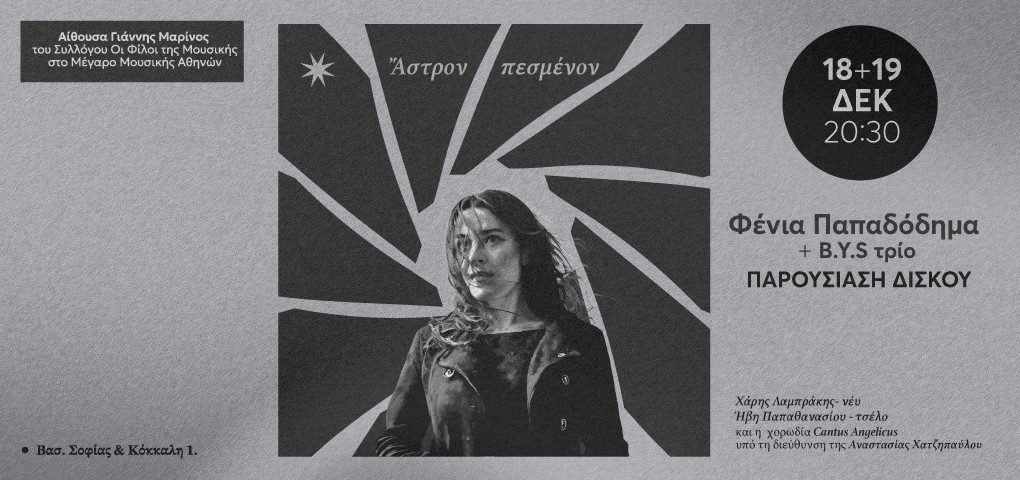 Η Φένια Παπαδόδημα παρουσιάζει το νέο της άλμπουμ «Άστρον πεσμένον» με τραγούδια που έγραψε τα τελευταία χρόνια κάτω από την επήρεια «της μαγείας του Αλέξανδρου Παπαδιαμάντη» και τα οποία παίχτηκαν και ηχογραφήθηκαν μαζί με το B.Y.S trio των Χ. Μπουκάλη. Κ. Γιαξόγλου και Ν. Σιδηροκαστρίτη. H παρουσίαση ξεκίνησε από χθές και γίνεται και σήμερα Παρασκευή 19 Δεκεμβρίου, στις 20:30, στη Μουσική Βιβλιοθήκη του Μεγάρου Μουσικής Αθηνών, στην Αίθουσα Γ. Μαρίνος.