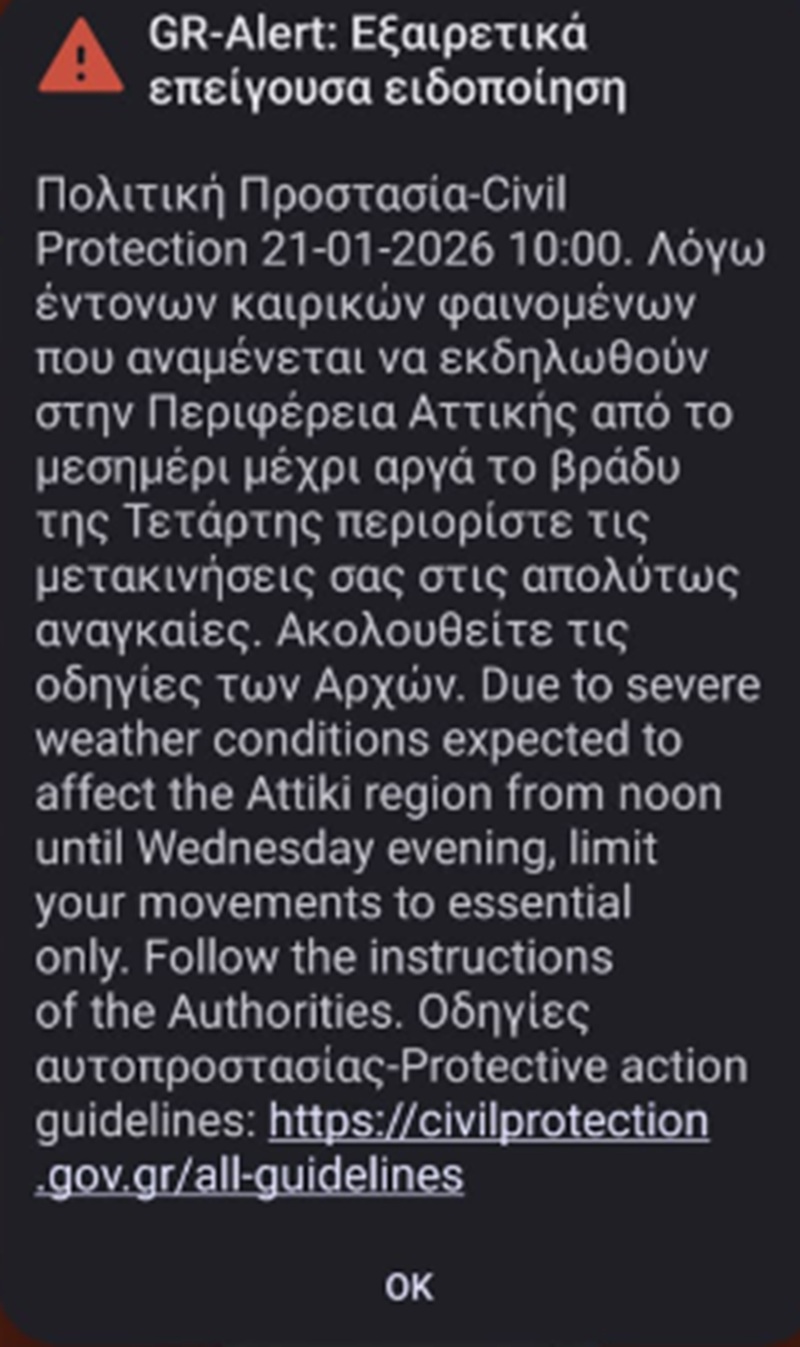 Μήνυμα 112 εστάλη στην Αττική στις 10:00 της Τετάρτης 21 Ιανουαρίου λόγω της κακοκαιρίας.