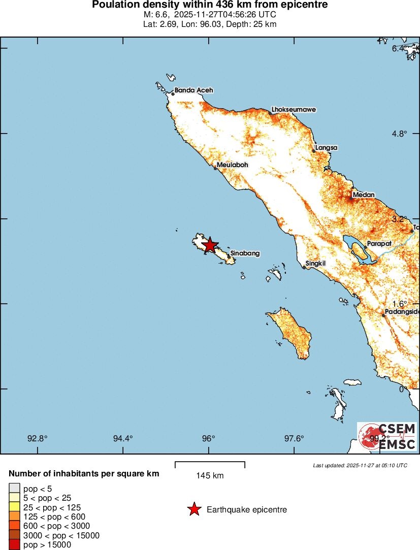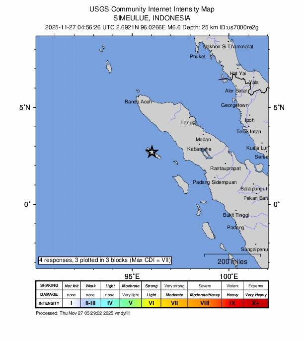 Ισχυρή σεισμική δόνηση 6,6 βαθμών της κλίμακας Ρίχτερ καταγράφηκε το πρωί της Πέμπτης (27/11) στις 11:56 τοπική ώρα στο Σίναμπανγκ της δυτικής Ινδονησίας, στη νήσο Σιμελούε, της επαρχίας Ατσέχ, όπως ανακοίνωσε το Αμερικανικό Ινστιτούτο Γεωλογικών Μελετών (USGS). Το επίκεντρο της δόνησης εντοπίστηκε 53 χλμ. δυτικά – βορειοδυτικά του Σίναμπανγκ, και το εστιακό βάθος υπολογίζεται 25χιλιόμετρα, σύμφωνα με το USGS.