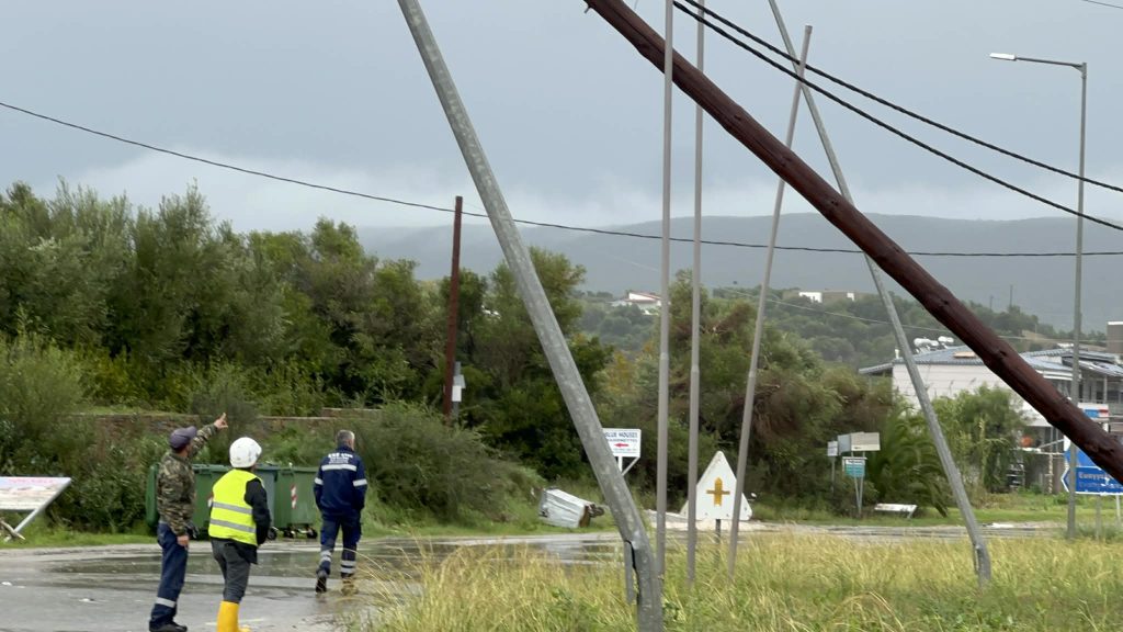 Από τις βλάβες στο δίκτυο, η περιοχή παραμένει χωρίς ρεύμα, με τα συνεργεία του ΔΕΔΔΗΕ να προσπαθούν να προσεγγίσουν τα σημεία.