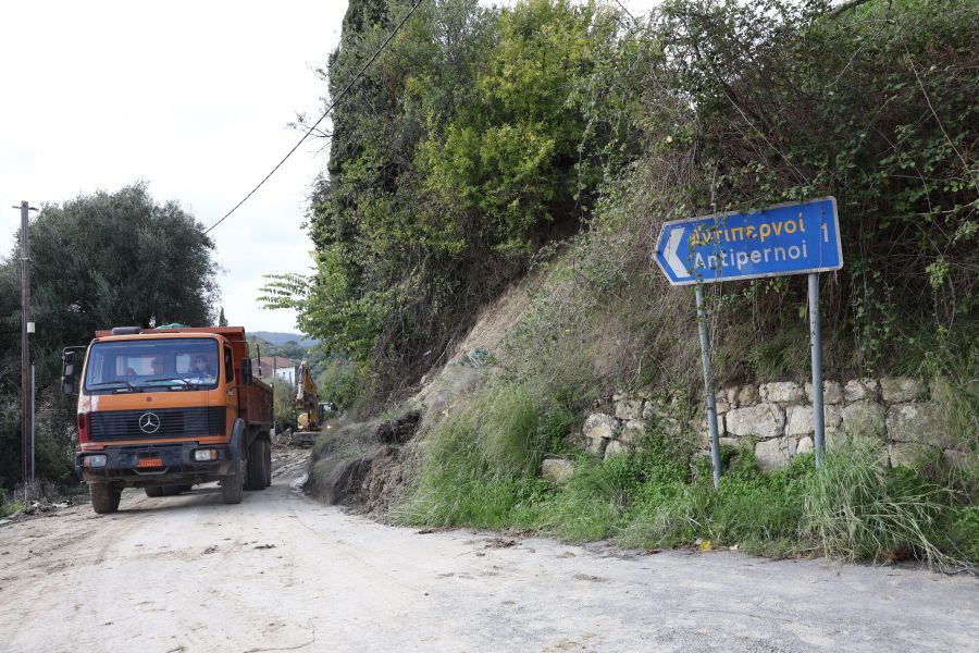 Σε άλλο σημείο του νησιού, μια ολόκληρη πλαγιά υποχώρησε δίπλα στο αστυνομικό τμήμα, προκαλώντας ζημιές σε υπηρεσιακά και ιδιωτικά οχήματα.