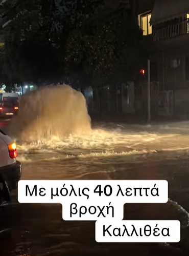 Πολλά είναι τα προβλήματα που προκαλεί ήδη η ισχυρή καταιγίδα που χτύπησε την Αττική, δημιουργώντας σοβαρές εστίες πλημμυρικών φαινομένων σε αρκετές περιοχές. Στην Καλλιθέα, ένας κεντρικός δρόμος όχι μόνο μετατράπηκε σε ποτάμι, αλλά παρουσίασε και ένα απρόσμενο… «συντριβάνι» στη μέση του οδοστρώματος, προσελκύοντας την προσοχή των κατοίκων.