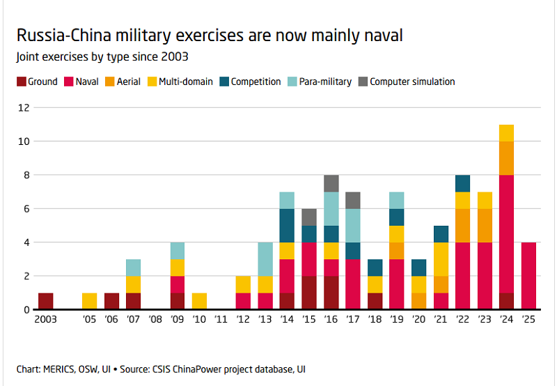Οι κοινές στρατιωτικές ασκήσεις Ρωσίας-Κίνας έχουν αυξηθεί σημαντικά σε αριθμό, μέγεθος, πολυπλοκότητα και γεωγραφικό εύρος από την εισβολή της Ρωσίας στην Ουκρανία. Από την πρώτη τους το 2003, οι δύο χώρες έχουν διεξάγει συνολικά 93 κοινές ασκήσεις – 28 από αυτές, ή σχεδόν το ένα τρίτο, από τις 24 Φεβρουαρίου 2022.