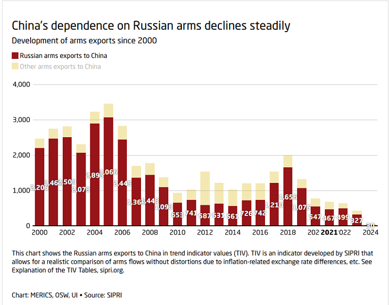 Η Κίνα έχει μειώσει σημαντικά τις εισαγωγές όπλων από τη Ρωσία τα τελευταία χρόνια. Αυτή η τάση οφείλεται στην αυξανόμενη αυτάρκεια της Κίνας στην στρατιωτική παραγωγή και έχει επιταχυνθεί από τη μείωση των εξαγωγών όπλων της Ρωσίας εν μέσω του πολέμου στην Ουκρανία. Ενώ οι ρωσικές παραδόσεις εξακολουθούν να αντιπροσωπεύουν το μεγαλύτερο μερίδιο των εισαγωγών όπλων της Κίνας (76% το 2023), η συνολική τους σημασία έχει μειωθεί, όπως αντικατοπτρίζεται στη μείωση του όγκου (Γράφημα 2)
