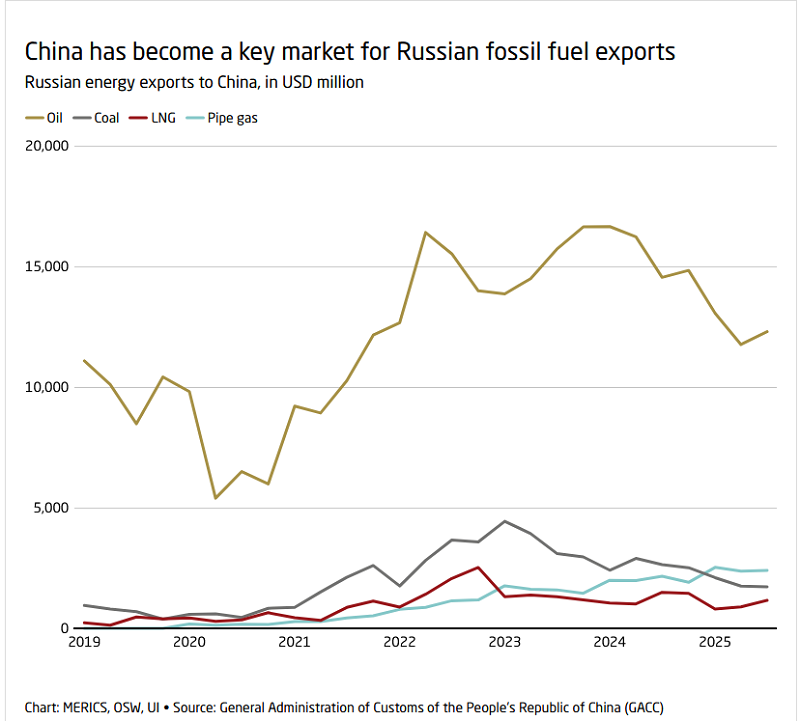 Οι ρωσικές εξαγωγές πετρελαίου προς την Κίνα αυξήθηκαν από το 2022 και μετά, φτάνοντας σε πάνω από 108 εκατομμύρια τόνους το 2024 – αύξηση περίπου 30% από το 2022. Το αυξανόμενο μερίδιο του ρωσικού πετρελαίου στις εισαγωγές της Κίνας είναι σε μεγάλο βαθμό συνέπεια των δυτικών κυρώσεων, οι οποίες ανάγκασαν τη Ρωσία να ανακατευθύνει τις εξαγωγές αργού πετρελαίου – ακόμη και με κάποια έκπτωση.