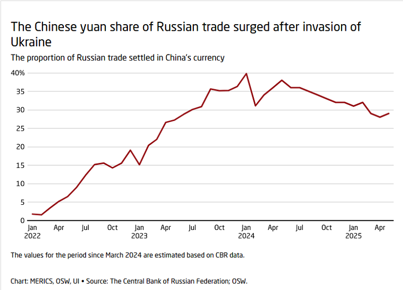 Ωστόσο, αυτή η τάση ανάπτυξης σταμάτησε μετά την ανακοίνωση του Υπουργείου Οικονομικών των ΗΠΑ ότι θα μπορούσε να επιβάλει δευτερογενείς κυρώσεις σε οντότητες τρίτων χωρών που βοηθούν τη στρατιωτικοβιομηχανική βάση της Ρωσίας. Έκτοτε, η Κεντρική Τράπεζα της Ρωσίας έχει σταματήσει να δημοσιεύει συγκεκριμένα στοιχεία για το μερίδιο του γουάν. Σύμφωνα με τις εκτιμήσεις μας που βασίζονται σε διαθέσιμα επίσημα στοιχεία, το μερίδιο του CNY στο διεθνές εμπόριο της Ρωσίας έχει έκτοτε μειωθεί σε περίπου 30%. Εν τω μεταξύ, ο ρόλος του εγχώριου νομίσματος της Ρωσίας, του ρουβλιού, έχει αυξηθεί σημαντικά (*11).