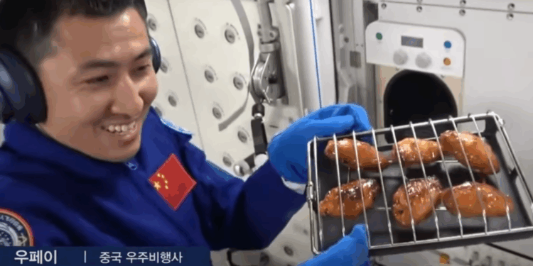 Σε βίντεο που δημοσιεύτηκε από το Xinhua, ο 32χρονος μηχανικός πτήσης Wu Fei – ο νεότερος Κινέζος αστροναύτης που στάλθηκε στο διάστημα – φαίνεται να αφαιρεί τις ψητές φτερούγες από τον φούρνο, δηλώνοντας ενθουσιασμένος: «Μυρίζει, φαίνεται και έχει υπέροχη γεύση».