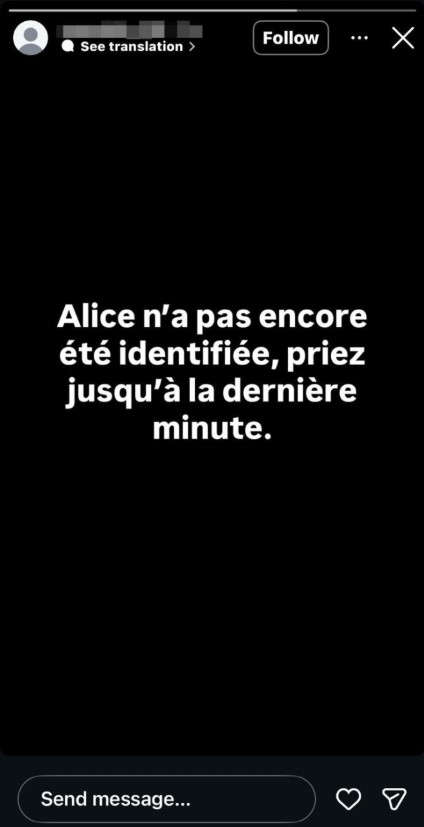 Ο Ρομέν Καλλέργης σε ανάρτησή του στο Instagram ανέβασε το εξής μήνυμα: «Η Αλίκη δεν έχει ακόμα ταυτοποιηθεί, προσευχηθείτε ως το τέλος»