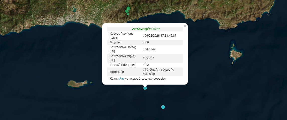 Τέσσερις σεισμοί καταγράφηκαν μέσα σε λίγη ώρα το απόγευμα της Παρασκευής 6/2, σε θαλάσσια περιοχή στην Κρήτη, στα ανοιχτά της Ιεράπετρας.